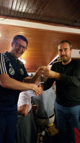 Zur Dritten Halbzeit fand man sich dann im Waldkircher Clubheim ein. Nachdem man wieder die herzhafte Schlachtplatte, serviert vom Förderverein-Team um Eugen Pracht, genossen hatte, überreichte man den siegreichen Waldkirchern eine DFB-Pokal (fast) in Originalgröße sowie eine Auswahl bester Yacher Schnäpse.