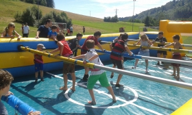 Am Sonntag, den 10.07.2016, fand bei wahrhaft tropischen Temperaturen auf dem Elzacher Sportplatz das Sommerfest der Fußballjugend SF Elzach-Yach statt. Neben kulinarischen Köstlichkeiten vom Grill war auch sportlich viel geboten: egal ob spannende Matches im XXL-Menschenkicker, willkommene Abkühlung auf der Seifenrutsche,beim Tauziehen oder bei der Absolvierung des DFB-Fußballabzeichens, es war für Jeden was dabei. Ein besonderer Dank geht an die Feuerwehr der Stadt Elzach, denn die Möglichkeit auf der Drehleiter das Geschehen von oben zu betrachten wurde von Groß und Klein gerne angenommen.