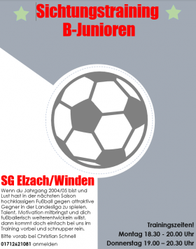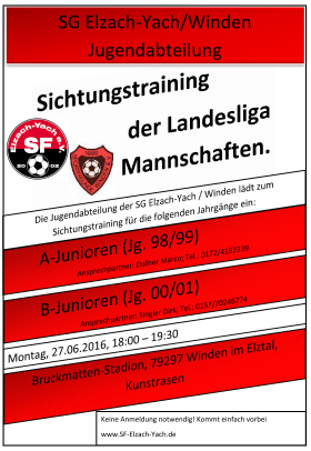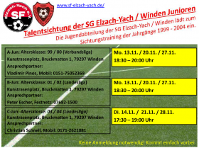 Die Jugendabteilung der SG Elzach-Yach / Winden lädt zum Sichtungstraining für die folgenden Jahrgänge ein. A-Junioren (Jg. 98/99) Ansprechpartner: Marco Dufner Tel.: 0172/4192339 B-Junioren (Jg. 00/01) Ansprechpartner: Dirk Singler; Tel.: 0157/70246774 Montag, 07.11.2016...