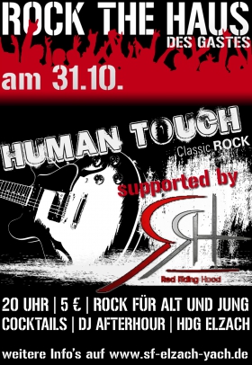 Nach dem Erfolg des Vorjahres geht „Rock the Haus“ am 31.10. in die 2. Runde. Auch dieses Jahr wird das Haus des Gastes in Elzach kräftig zum Wackeln gebracht. Headliner ist wieder die in ganz Südbaden bekannte und gefeierte Cover-Rock-Band „Human Touch“. Mit ihrem unverkennbaren Gitarrensound und charismatischen Liedgesang sind sie ein Garant für einen gelungenen Abend. Vor den Routiniers heizt die junge und schon sehr erfolgreiche Elzacher Band „Red Riding Hood“ die Menge ein. Die Jungs schreiben sogar eigene Songs, Inspirationen dazu gaben keine geringeren Größen wie Jimi Hendrix oder Led Zeppelin. Dieser Mix mit bekannten Covers aus der Rockmusik sind ein Garant für beste Unterhaltung. Ab 20 Uhr sind die Tore am 31.10. im Haus des Gastes in Elzach für euch geöffnet. Mit Cocktails, Getränkespecials in der Bar uvm. ist für das leibliche wohl auch alles bestellt.